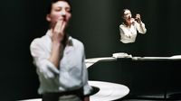 HARING: (Ze denkt lang na, aarzelt en dan verschijnt die typische, rustig gefocuste blik in haar ogen. Bijna fluisterend citeert ze een stukje tekst) ‘Beweging is pijnlijk / en het raakt enkel het apparaat dat de snaren stemt / het instrument zelf heeft stil de sluimerstand betreden.’ (Stilte) Dit raakt de kern van UNISONO.